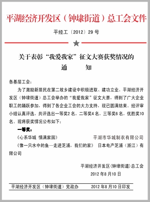 日前,由平湖經(jīng)濟(jì)開發(fā)區(qū)(鐘埭街道)總工會舉辦的“我愛我家”征文比賽圓滿結(jié)束,我集團(tuán)公司下屬華城制衣有限公司員工易發(fā)采榮登榜首。
