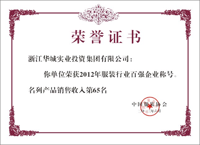 日前,中國服裝協(xié)會正式發(fā)布“2012年服裝行業(yè)百強(qiáng)企業(yè)”名單,全國共有143家企業(yè)榜上有名,其中浙江38家,作為平湖服裝企業(yè)龍頭單位的浙江華城實(shí)業(yè)投資集團(tuán)有限公司再次榮獲百強(qiáng)企業(yè)光榮稱號。