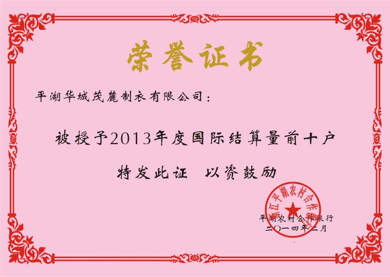 日前,平湖華城茂麓制衣有限公司以突出的業(yè)績(jī),被平湖農(nóng)村合作銀行授予“ 2013年度 國(guó)際結(jié)算量前十戶”稱(chēng)號(hào)。