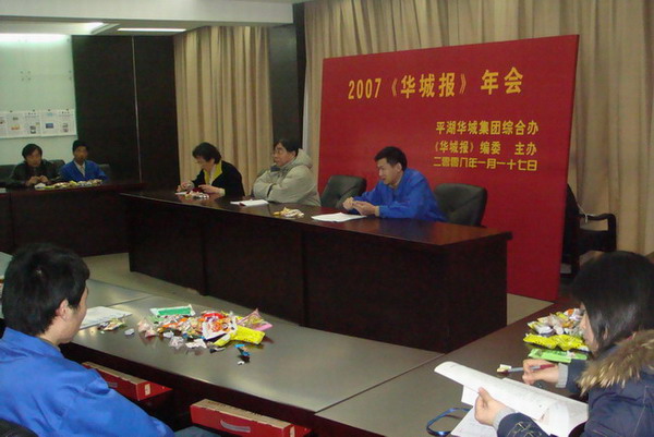 1月17日,在公司四樓會議室召開《華城報》2007年度年會,共有30幾位通迅員代表參加。會上,《華城報》主編凌中強(qiáng)對2007度《華城報》的一些工作情況向與會代表做了祥細(xì)的匯報,并做了08年工作的一些具體布署。市文化館張德賢老師也應(yīng)邀參加此次年會,并向各位代表做了一些指導(dǎo)性的講解!度A城報》做為華城文化的一個載體,起著承上啟下的作用。經(jīng)過全體編輯和廣大通迅員的共同努力,取得了一系列成績,便面對成績,廣大通迅員一致表示,今后一定要多學(xué)習(xí),多鍛練,把《華城報》辦得更有特色,更具風(fēng)格,更深入人心。