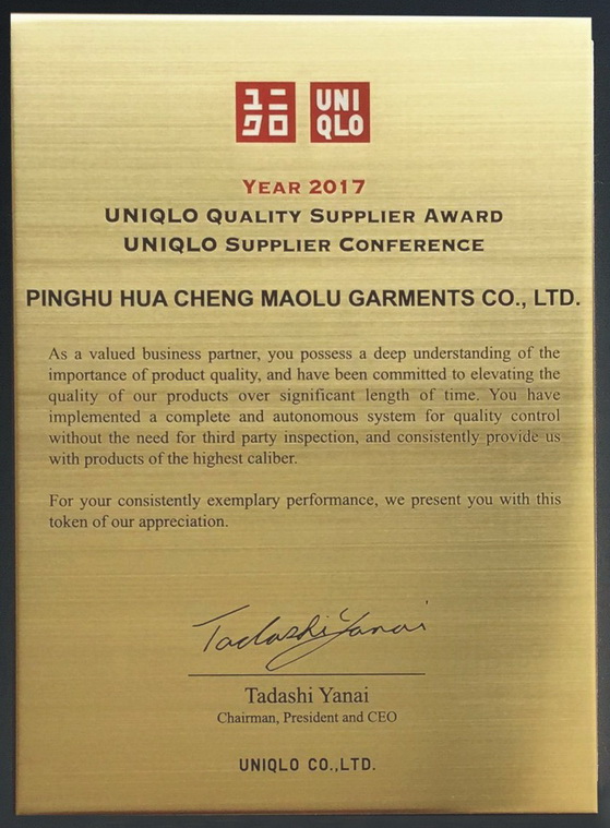2017年2月底,迅銷集團公布了全球146家供應(yīng)商名單,其中中國88家,我公司就是其中最優(yōu)秀的供應(yīng)商之一。“追求一流的客戶,生產(chǎn)頂尖的世界品牌!边@是我公司的企業(yè)經(jīng)營目標,F(xiàn)R正是這樣的好客戶。圍繞客戶需求,了解客戶理念,在與FR合作的十九年里,我公司始終用最優(yōu)秀的理念培養(yǎng)最優(yōu)秀的員工,生產(chǎn)最優(yōu)質(zhì)的產(chǎn)品,提供最貼心的服務(wù),與客戶共同奮斗,共同成長。感謝FR客戶提供給我們的廣闊天地,感謝我們每一位員工作出的每一份努力和貢獻。