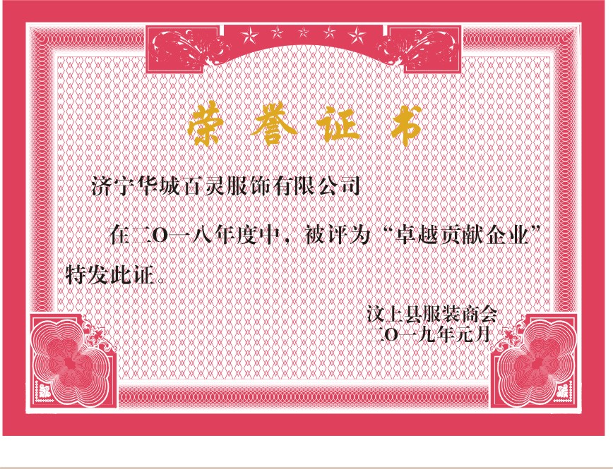 會上,在年度報告中指出,2018年汶上縣紡織服裝產(chǎn)業(yè)主營業(yè)務(wù)收入首次突破百億元大關(guān),預(yù)計實現(xiàn)主營業(yè)務(wù)收入103億元,成功晉升百億級產(chǎn)業(yè)集群。在全縣工業(yè)企業(yè)納稅前50名中,紡織服裝產(chǎn)業(yè)占22家,上繳稅金1.16億元,增長30.1%,在納稅過千萬元的11家加工制造企業(yè)中,就有三家紡織服裝企業(yè),濟寧華城百靈服飾有限公司就是其中之一,在全縣工業(yè)企業(yè)納稅前50名中排名14,服裝企業(yè)排名第二,在2018年度中,被評為“卓越貢獻企業(yè)”