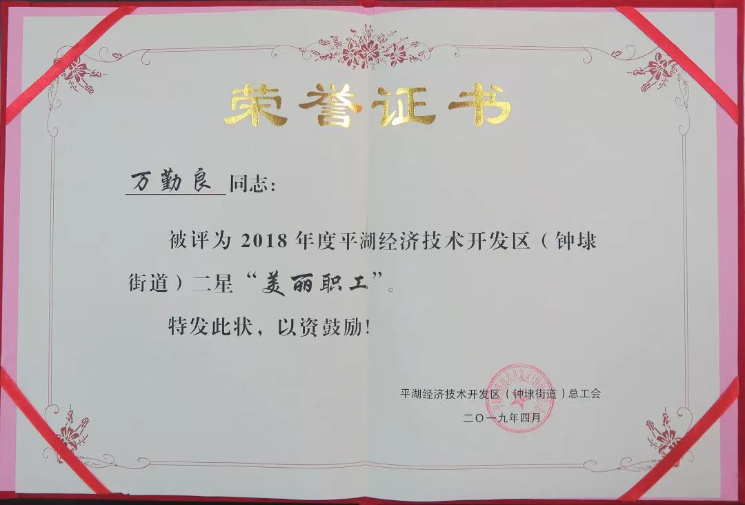 華城衣歌員萬勤良榮獲在平湖經(jīng)濟技術(shù)開發(fā)區(qū)“星級三美”爭創(chuàng)活動中被評為二星“美麗職工”稱號。