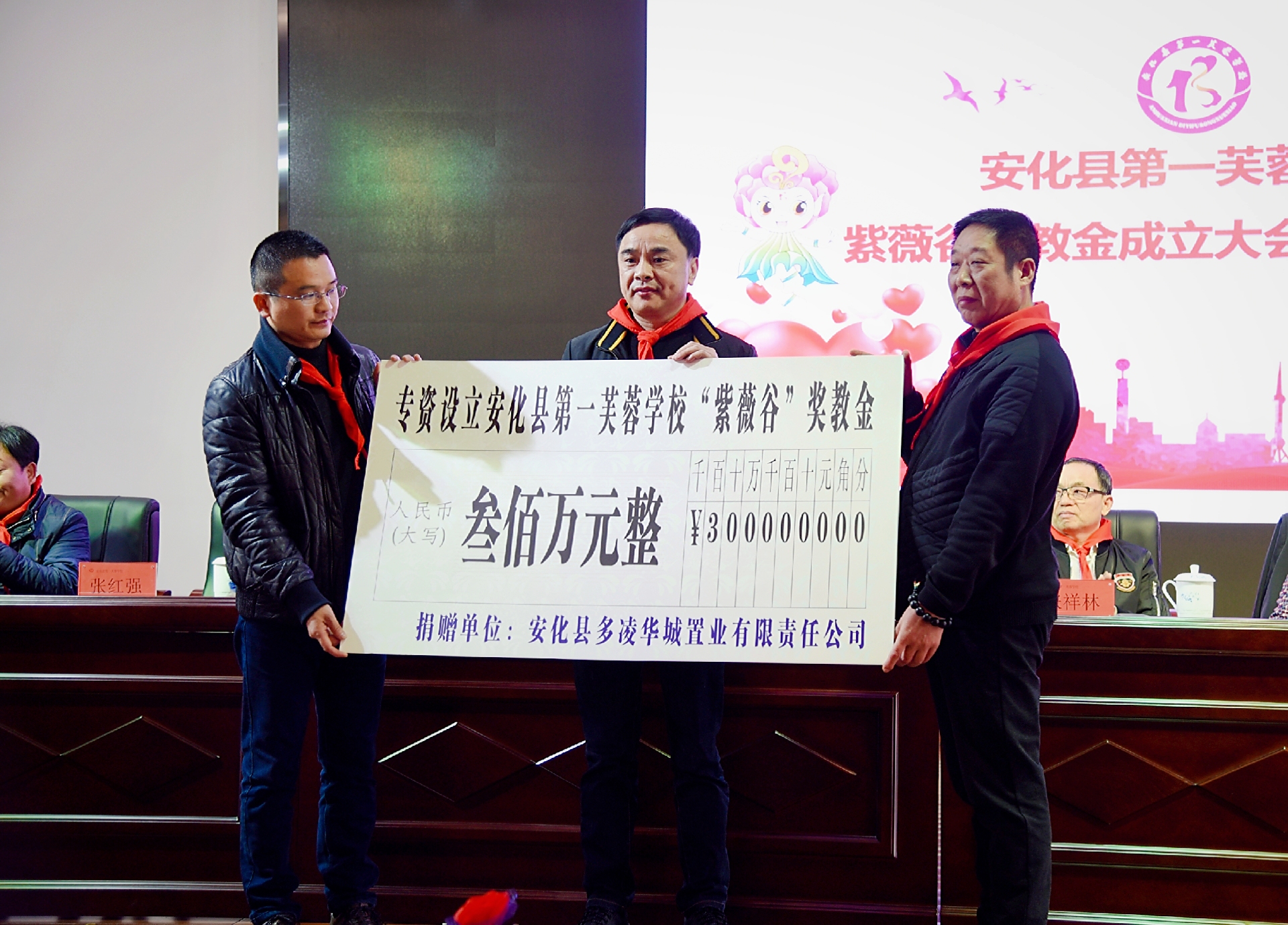 12月10日下午,“安化縣第一芙蓉學(xué)校紫薇谷獎(jiǎng)教金成立暨捐贈(zèng)儀式”在安化縣第一芙蓉學(xué)校舉行。安化縣副縣長(zhǎng)胡能華、浙江華城實(shí)業(yè)投資實(shí)業(yè)集團(tuán)有限公司董事長(zhǎng)張祥林、多凌控股集團(tuán)有限公司董事長(zhǎng)張余林,安化縣教育局、縣城南區(qū)管委會(huì)、安化縣慈善總會(huì)等部門(mén)領(lǐng)導(dǎo)及全體師生和學(xué)生家長(zhǎng)代表參加了捐贈(zèng)儀式。
