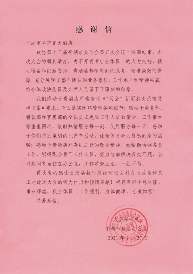 2021年2月23日至2月27日,圣雷克大酒店圓滿地完成了平湖政協(xié)第十三屆五次會(huì)議的接待任務(wù)。