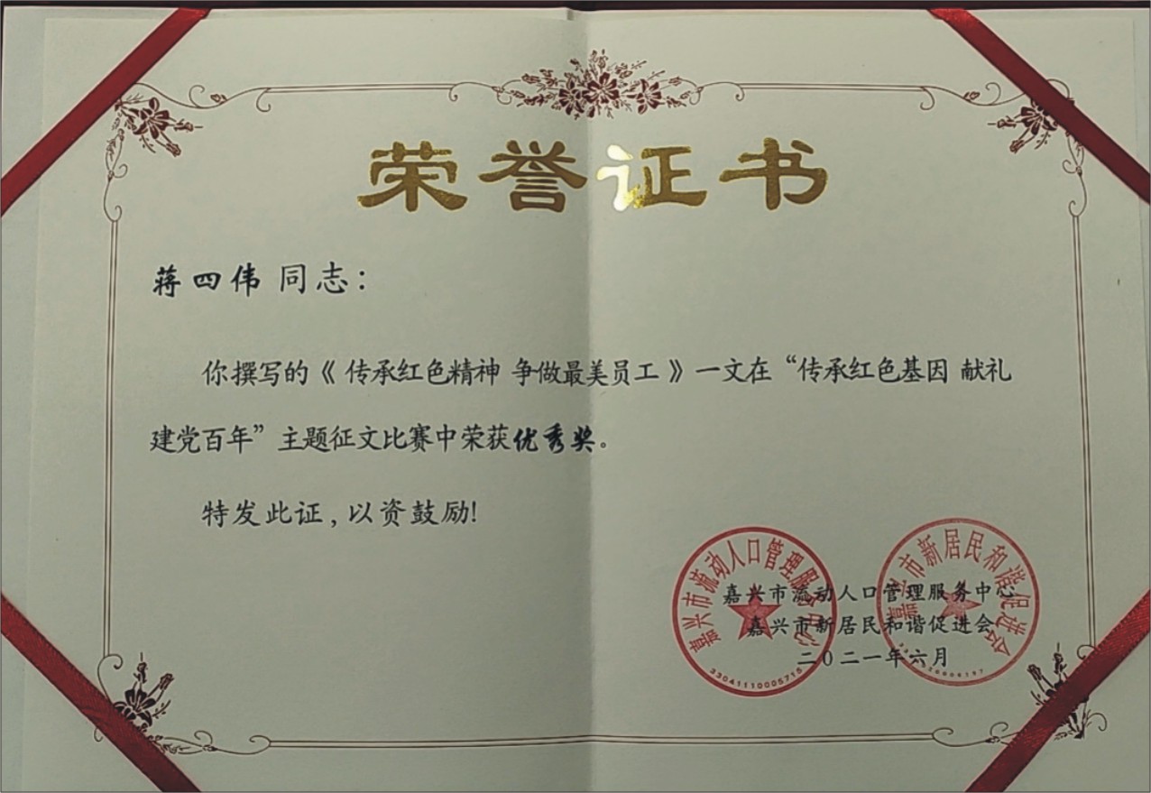 在建黨百年到來之際,嘉興市流動(dòng)人口管理服務(wù)中心及嘉興市新居民和諧促進(jìn)會(huì)組織舉辦了“傳承紅色基因•獻(xiàn)禮建黨百年”主題征文比賽。我公司員工蔣四偉以《傳承紅色精神•爭做最美員工》一文獲得征文比賽優(yōu)秀獎(jiǎng)。此次嘉興市征文比賽,平湖僅有2人獲獎(jiǎng),足以證明這個(gè)獎(jiǎng)項(xiàng)具有一定的含金量。