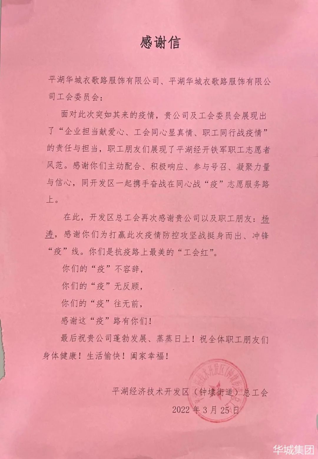 來(lái)信對(duì)華城衣歌路及其工會(huì),在疫情防控工作中所作的貢獻(xiàn)給予高度的評(píng)價(jià)與感謝。信中肯定和表彰了企業(yè)克服現(xiàn)實(shí)中的重重困難,在第一時(shí)間積極展開(kāi)抗“疫”行動(dòng),企業(yè)擔(dān)當(dāng)獻(xiàn)愛(ài)心,工會(huì)同心顯真情,職工同行戰(zhàn)疫情。