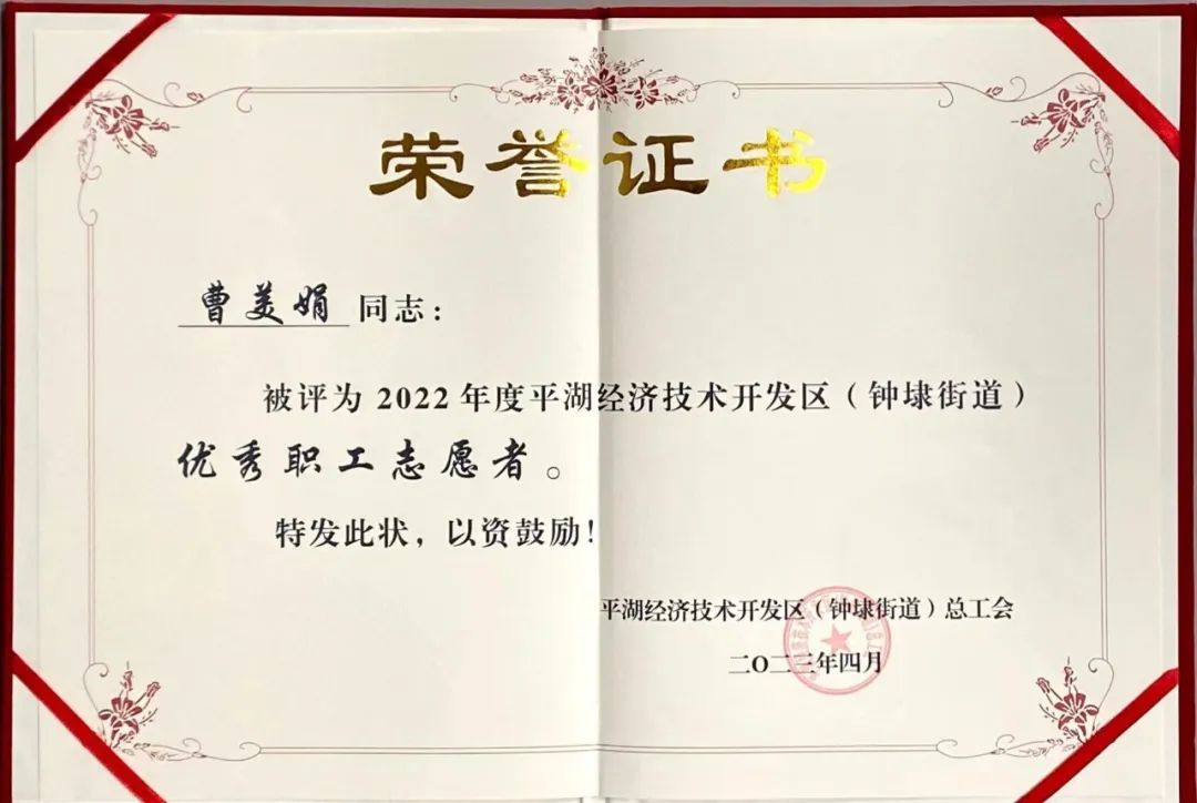 平湖華城茂麓制衣有限公司員工曹美娟榮獲“2022年度平湖經濟技術開發(fā)區(qū)(鐘埭街道)優(yōu)秀職工志愿者”稱號;