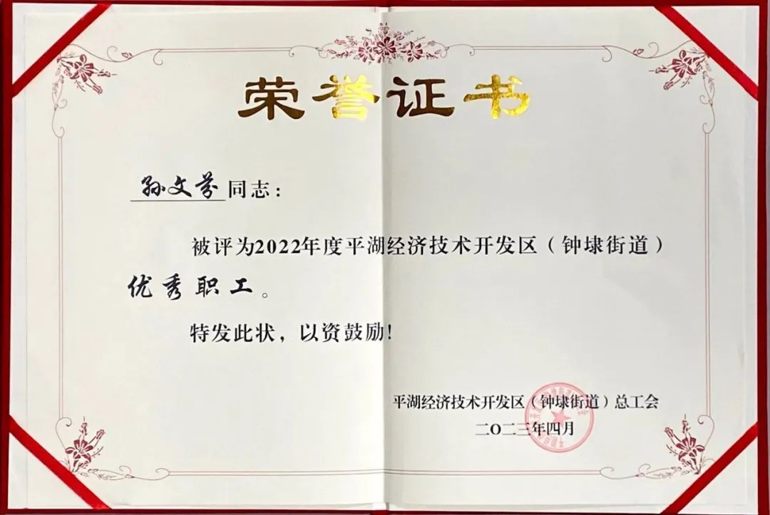 平湖市華城制衣股份有限公司員工孫文芬榮獲“2022年度平湖經濟技術開發(fā)區(qū)(鐘埭街道)優(yōu)秀職工”稱號;