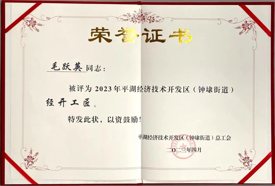 平湖華城茂麓制衣有限公司員工毛躍英榮獲“2023年平湖經濟技術開發(fā)區(qū)(鐘埭街道)經開工匠”稱號。