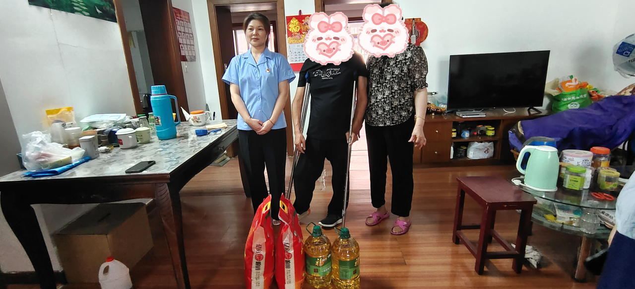 最后一站,西林寺東區(qū)孤老熊女士家里。熊女士丈夫今年去世,領(lǐng)養(yǎng)的兒子是殘疾人,是社區(qū)比較關(guān)注的特殊群體之一。當看到社區(qū)和企業(yè)送上門來的油和米,熊女士非常感動,這也極大地增加了她對生活的樂觀心情。