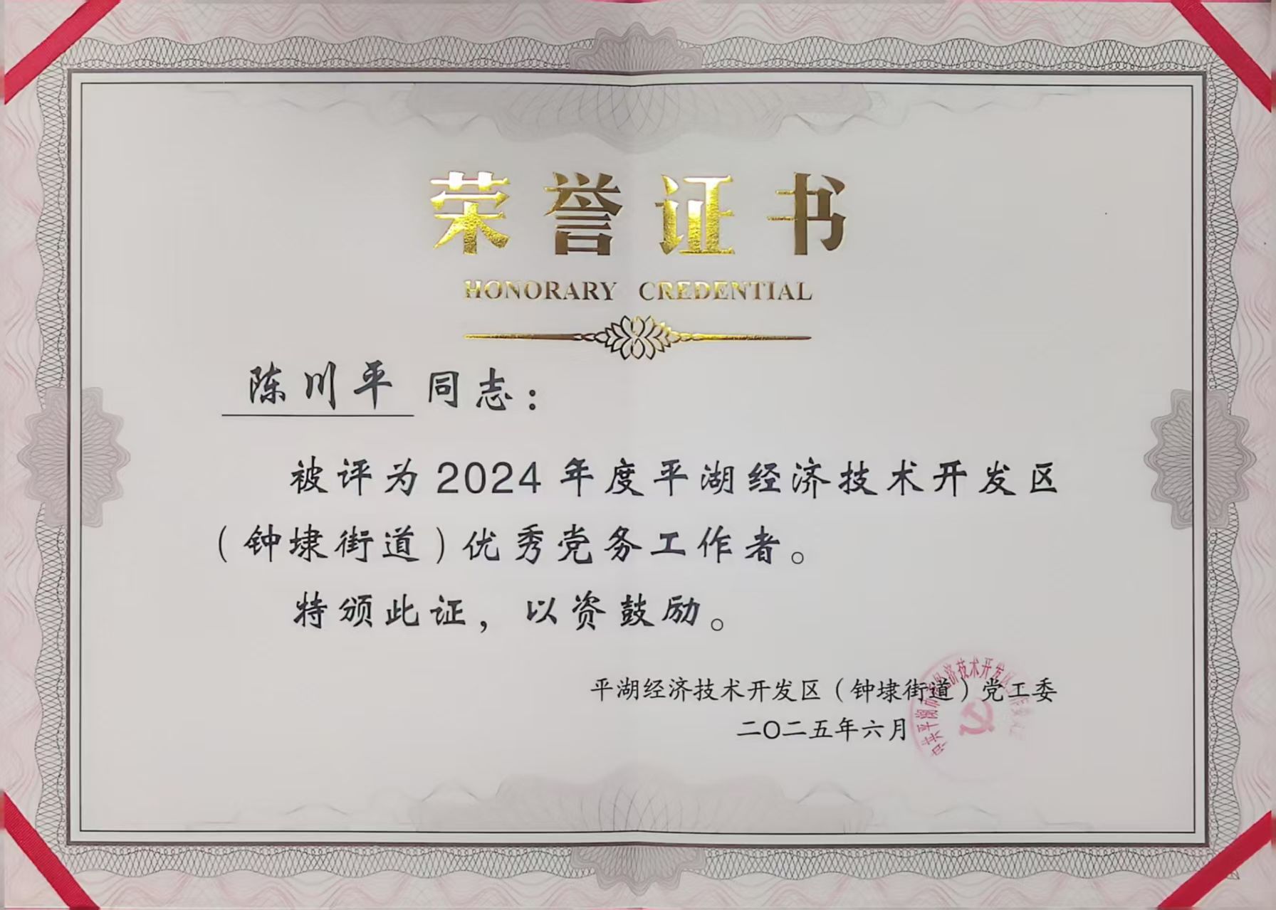 華城集團黨委副書記陳川平榮獲“2024年度平湖經濟技術開發(fā)區(qū)優(yōu)秀黨務工作者”稱號。