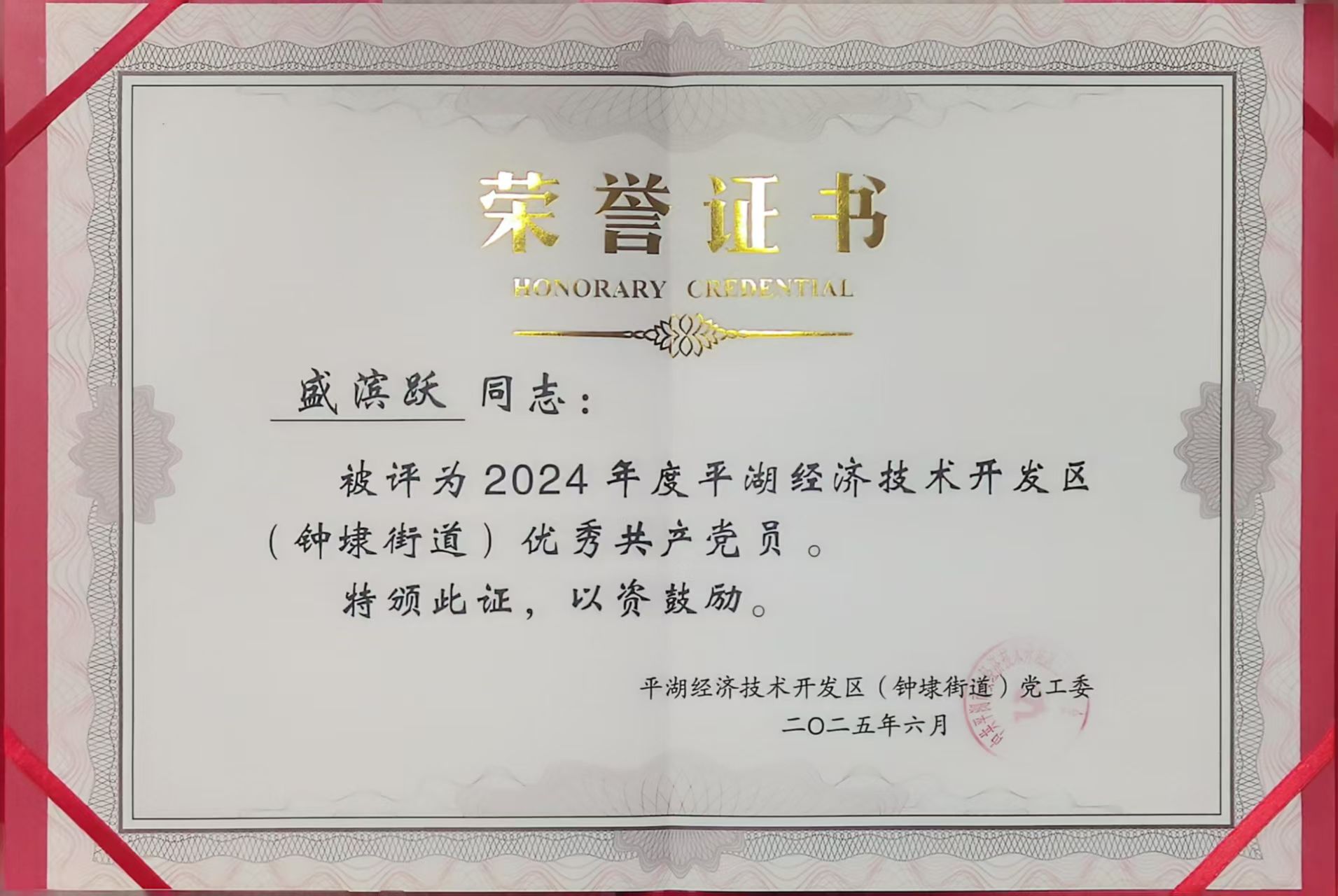 締雅服裝黨支部盛濱躍榮獲“2024年度平湖經濟技術開發(fā)區(qū)優(yōu)秀共產黨員”稱號。
