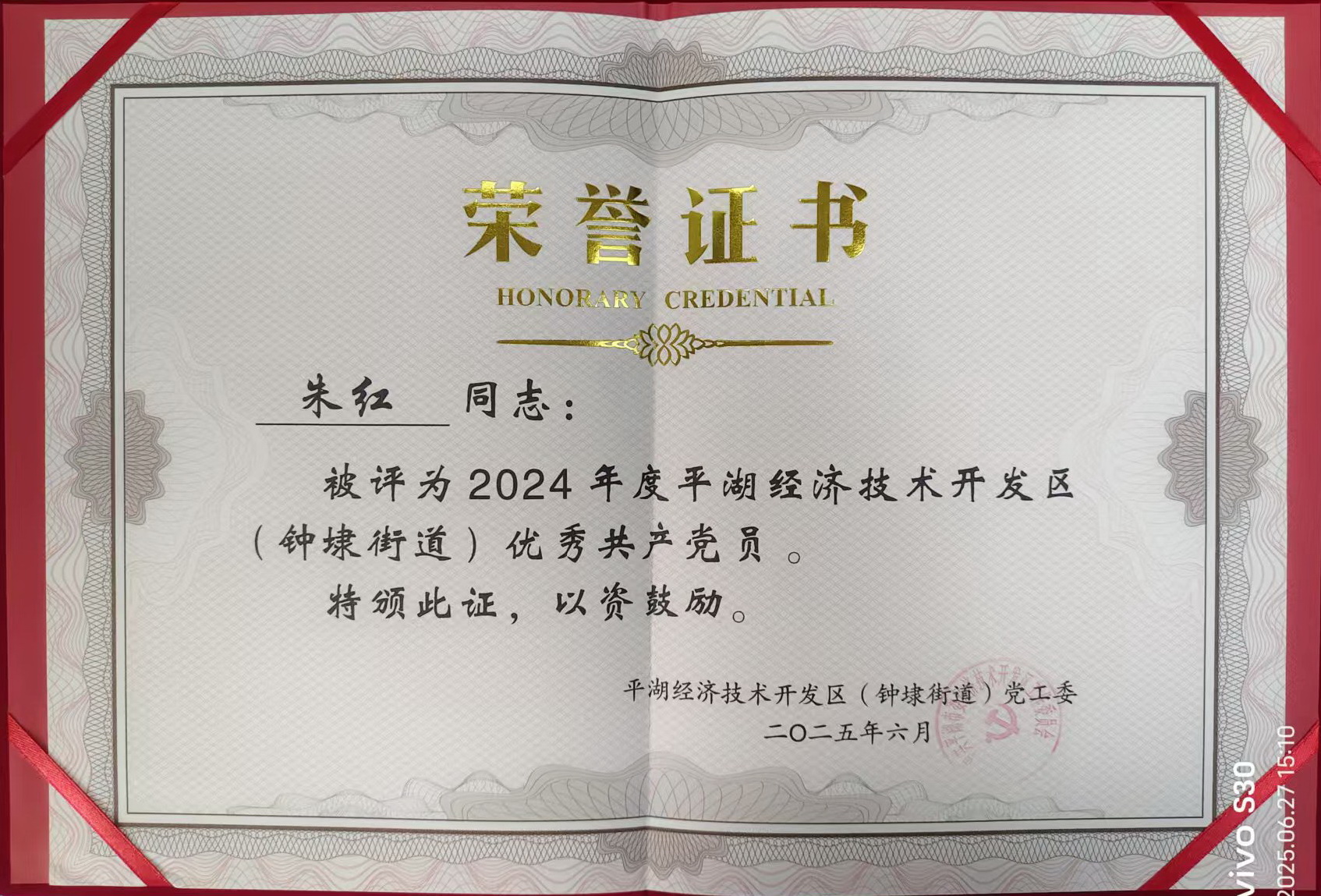華城制衣黨支部朱紅榮獲“2024年度平湖經濟技術開發(fā)區(qū)優(yōu)秀共產黨員”稱號。